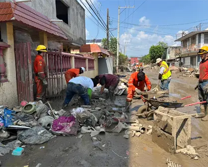 La brigada Yucatán continúa su labor en Poza Rica, Veracruz, apoyando la limpieza, desazolve y recuperación de viviendas y calles afectadas por las recientes inundaciones.