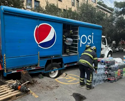 La pesada unidad quedó atrapada al subir a la banqueta para abastecer un edificio, servicios de emergencia trabajaron por casi una hora