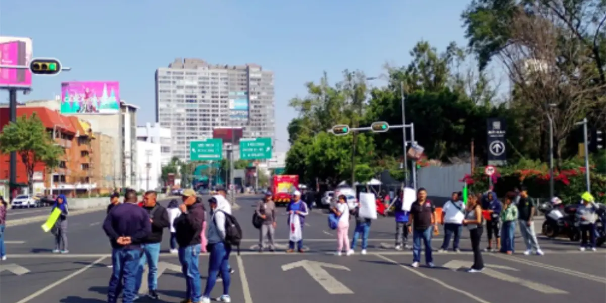 Grupo de personas realizando bloqueo vial durante marcha en CDMX