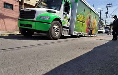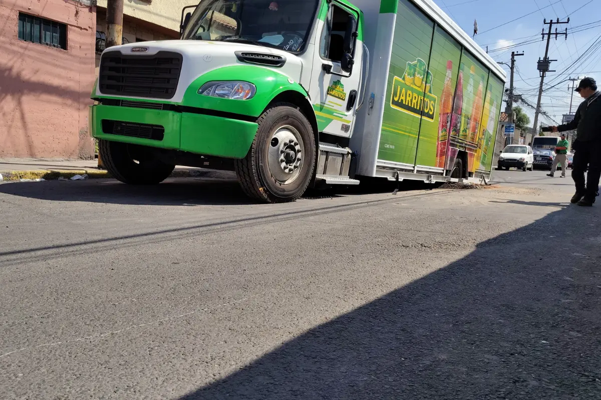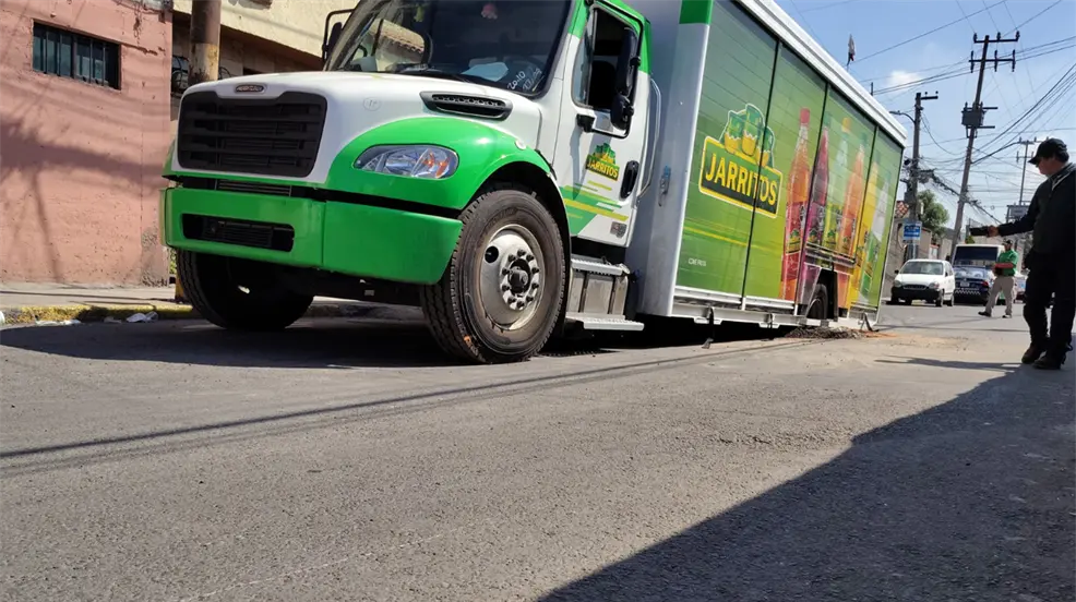 De acuerdo con testigos, el camión transitaba con normalidad por la vialidad cuando, de manera repentina, el pavimento se hundió debido a la tierra suelta que había debajo. Una de las llantas traseras quedó atrapada dentro del socavón, lo que impidió que la unidad continuara su camino.