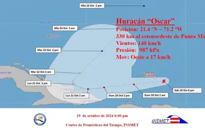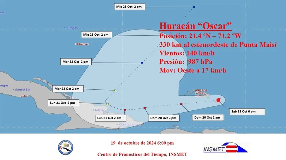 Cuba.- El huracán Oscar, de categoría 1, se aproxima a Cuba, donde las autoridades han emitido una alerta para las provincias orientales como Guantánamo, Santiago de Cuba, Holguín, Granma, Las Tunas y Camagüey, debido a los vientos sostenidos de hasta 130 km/h y las posibles marejadas ciclónicas.