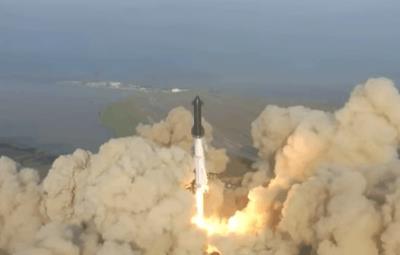 Desde una plataforma de lanzamiento en costa sur de Texas, el enorme cohete propulsor Super Heavy, que alberga 33 motores, despegó enviando un gran estallido a través del paisaje costero.