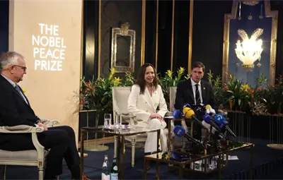 Machado arribó durante la madrugada del jueves 11 de diciembre a Oslo, Noruega, en donde posteriormente ofreció dos conferencias: una tras su primera aparición pública desde enero de este año y la segunda organizada por el comité del Nobel.