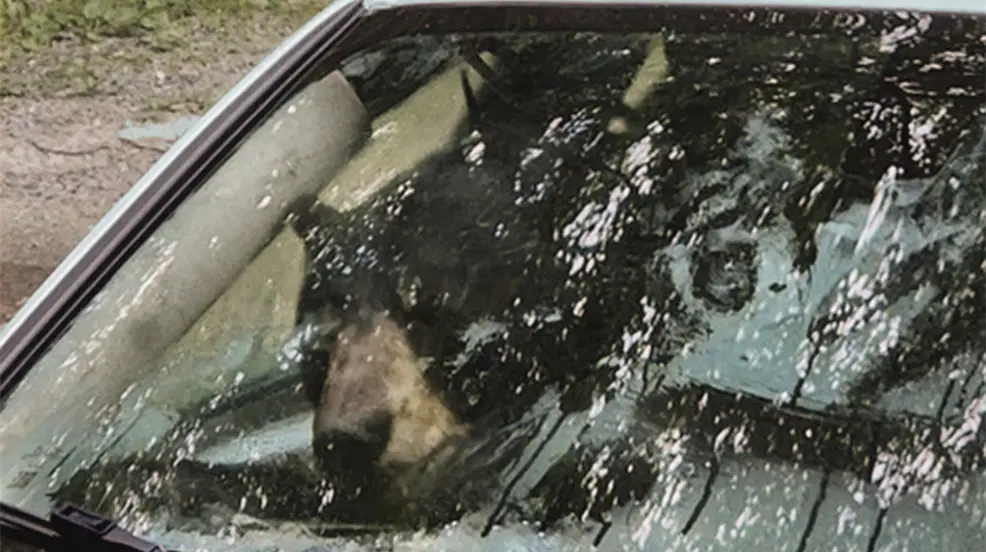 Oso negro y osezno quedan atrapados en un coche y lo destrozan