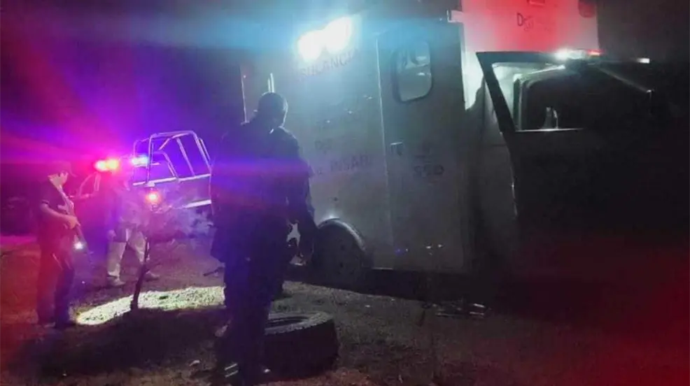 CANELAS, Durango. - Una ambulancia que realizaba el traslado de una persona herida, tuvo un percance en el que una de sus llantas terminó ponchada, interrumpiendo el recorrido que realizaba esta unidad, quedando varada en la orilla de la carretera.