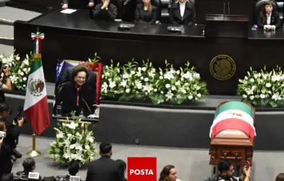 Fue así que, pocos minutos después, el ataúd fue dejado frente a la tribuna, colocándose sobre él la bandera de México, mientras a su alrededor se adornó con varios arreglos florales y, a su lado, dos cuadros con retratos suyos.