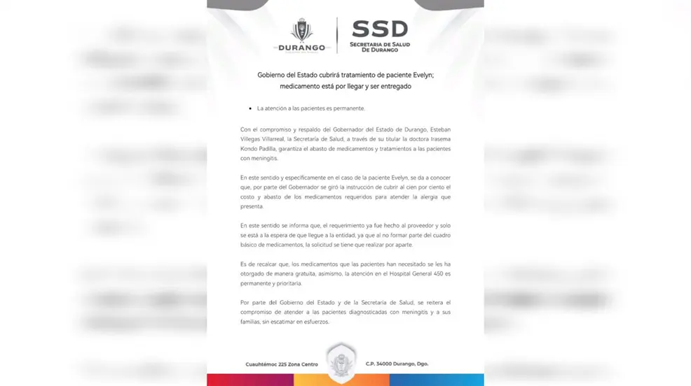 “En este sentido y específicamente en el caso de la paciente Evelyn, se da a conocer que, por parte del Gobernador se giró la instrucción de cubrir al cien por ciento el costo y abasto de los medicamentos requeridos para atender la alergia que presenta”, informó la SSA y recalcó que al ser un medicamento que no está dentro del cuadro básico se tuvo que hacer una petición particular al proveedor del mismo.