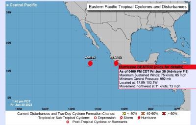 El huracán Beatriz se desplaza con dirección noroeste a una velocidad de 20 km/h y se espera que mantenga esa trayectoria hasta que comience a debilitarse el sábado.