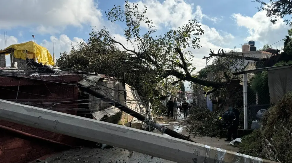 La caída de un árbol de 15 metros durante la tormenta dejó siete casas afectadas en la colonia San Nicolás Totolapan, donde los postes de la CFE también colapsaron.