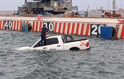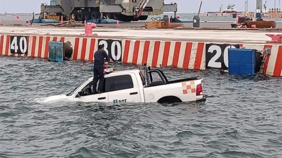 Caen trabajadores del SAT con todo y camioneta al mar en el puerto de Veracruz