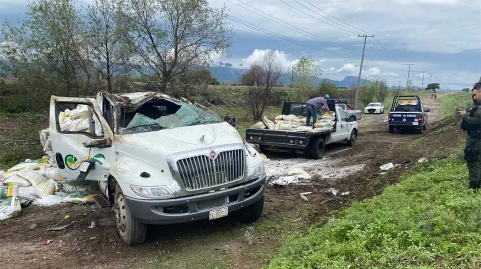 NUEVO IDEAL, Durango. - Se registró una volcadura de un vehículo tipo camión en la carretera de Nuevo Ideal a Santiago Papasquiaro, la unidad siniestrada se encargaba de transportar fertilizante, al lugar de los hechos se dieron citas diversas autoridades para esclarecer las causas del accidente.