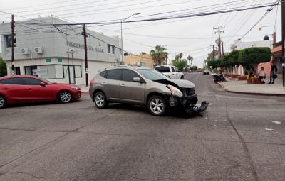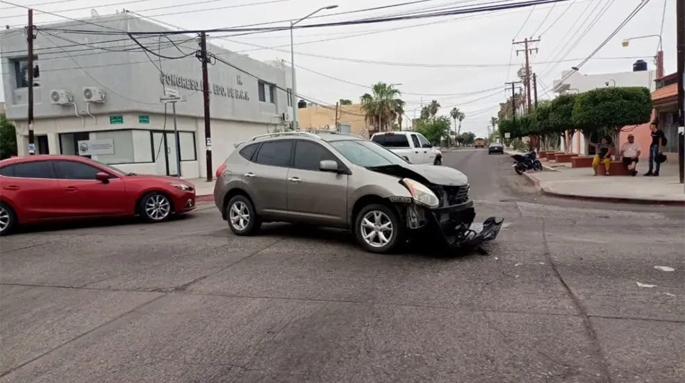 LA PAZ, Baja California Sur.- Un aparatoso choque entre una camioneta Nissan Rogue y un automóvil Hyundai Elantra se registró esta mañana en el cruce de las calles Félix Ortega y Allende, en pleno centro de la ciudad.