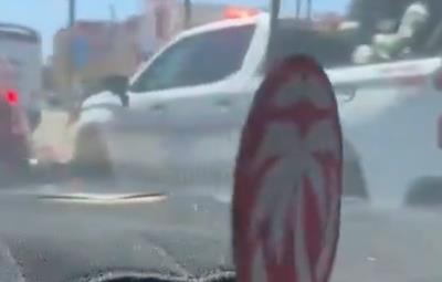 En las imágenes se observa como el conductor de la motocicleta intenta incorporarse a la vialidad, pero se mete “a la brava” frente a la camioneta oficial, lo que provoca que sea embestido.