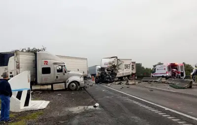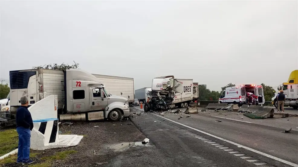 JALTENCO, Estado de México.- Un aparatoso choque múltiple entre vehículos de carga mantiene cerrado el Circuito Exterior Mexiquense a la altura del kilómetro 26 en la zona de Jaltenco.