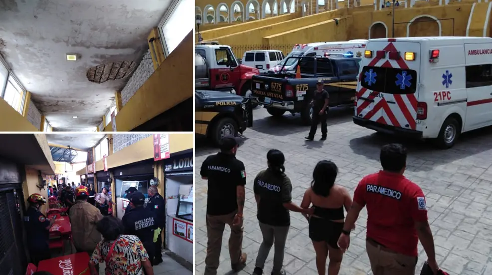 MÉRIDA, Yucatán.- Esta mañana, varias partes del techo del mercado público de Izamal se desprendieron, cayendo sobre mesas y sillas y causando pánico entre los presentes. La situación provocó la movilización inmediata de paramédicos, bomberos y agentes de la Secretaría de Seguridad Pública (SSP).