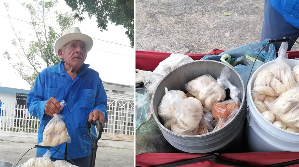 Don Jacinto no es un extraño para los residentes de Mérida. Hace décadas, era común verlo caminar por la colonia México, cargando cubetas llenas de buñuelos, merengues y pan de elote. Ahora, aunque su andar es más lento y se ayuda de un carrito para transportar sus productos. Originario de un pueblo fuera de la ciudad, Don Jacinto y su esposa comenzaron este negocio para ofrecer a los vecinos postres caseros que se han vuelto una tradición en la zona.