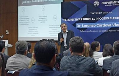 Atendiendo la invitación por parte del Centro Empresarial Coahuila Sureste (COPARMEX) y el Consejo Cívico de las Instituciones de Coahuila, Lorenzo Córdova comunicó la labor que tiene el INE en este proceso electoral.