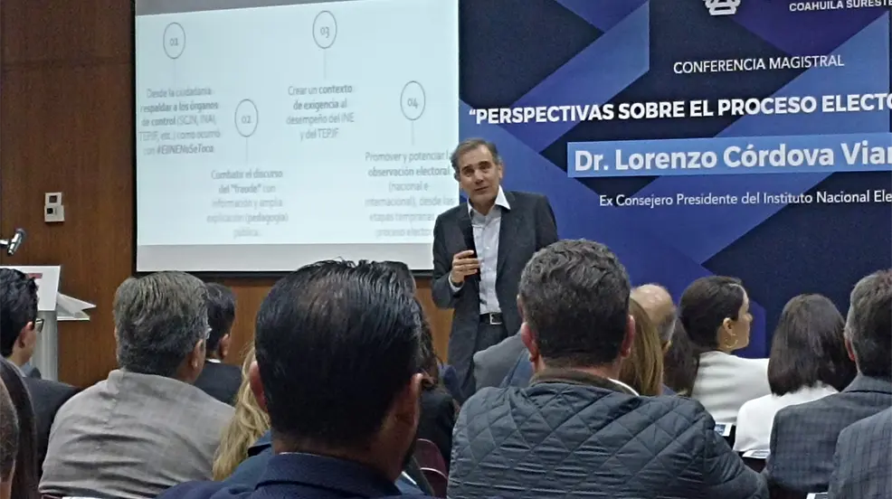 En la conferencia Córdova comentaba sobre las elecciones y los 'supuestos fraudes' que han sido acusados en el pasado. Dijo que el en el sistema electoral hay una alternancia de partidos políticos y que en las últimas elecciones se dio algo inédito con un 62% de alternancia. Aunque Coahuila es uno de los estados donde se tiene una excepción el catedrático dijo: