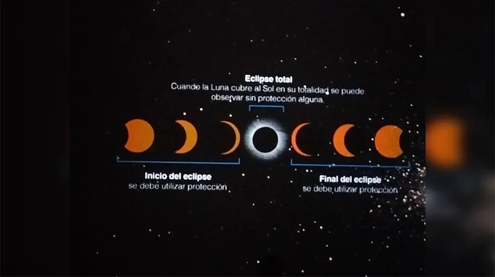 De inicio hay una parcialidad, la luna llega a cubrir el sol y luego viene la totalidad que es prácticamente de anillo de diamante a nuevamente anillo de diamante (un efecto provocado por el contorno de la luz solar en la circunferencia de la luna) entre esos momentos habrá oscuridad total, después, para el cierre hay otra fase parcial.