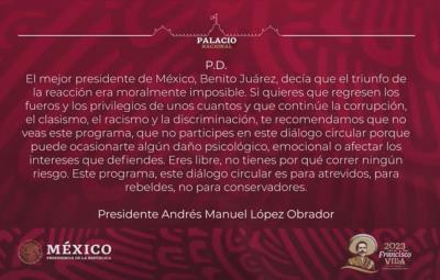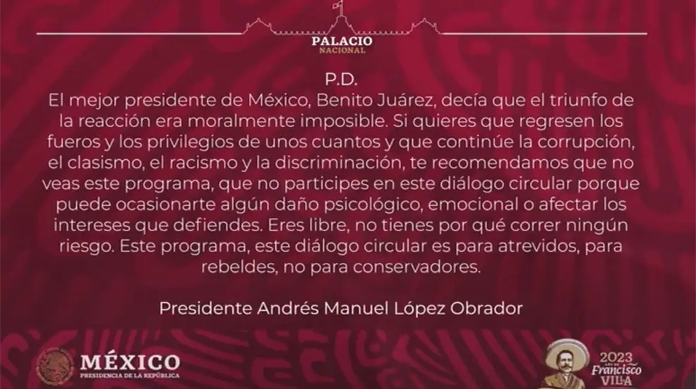 “El mejor presidente de México, Benito Juárez, decía que el triunfo de la reacción era moralmente imposible. Si quieres que regresen los fueros y los privilegios de unos cuantos y que continúe la corrupción, el clasismo, el racismo y la discriminación, te recomendamos que no veas este programa, que no participes en este diálogo circular porque puede ocasionarte algún daño psicológico, emocional o afectar los intereses que defiendes”