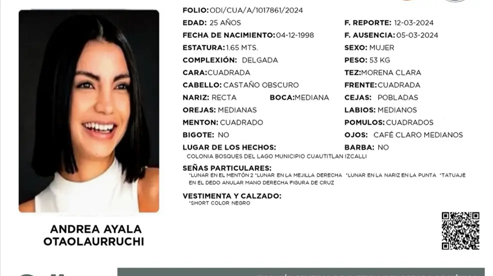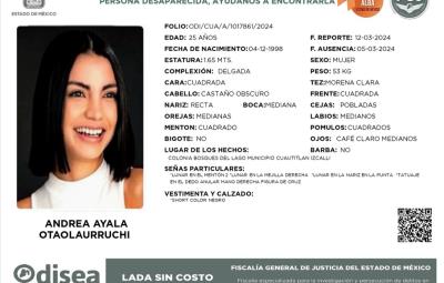 Andrea Otaolaurruchi, mide 1.65 metros de altura y en el momento de su desaparición vestía un short color negro. Según información proporcionada por la Fiscalía del Estado de México, la joven se encuentra desaparecida desde el pasado 12 de marzo.