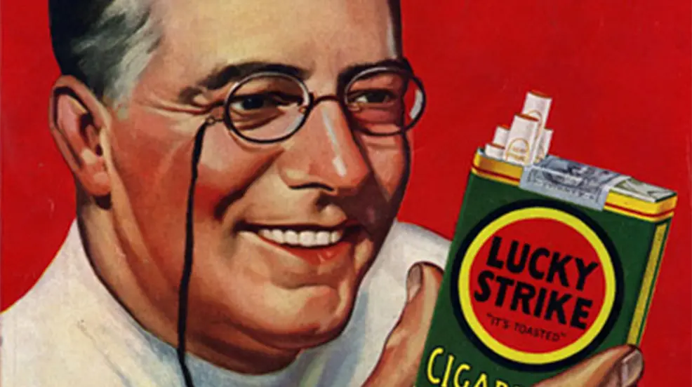 Durante gran parte del siglo XX, la industria tabacalera promocionó el hábito de fumar como algo beneficioso, elegante y avalado por figuras públicas e incluso profesionales de la salud. Desde los años 20 hasta casi los 60, las campañas publicitarias presentaban a doctores, dentistas, actores y actrices recomendando determinadas marcas de cigarrillos, llegando al punto de afirmar que ejercitaban los pulmones y mejoraban la salud.