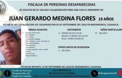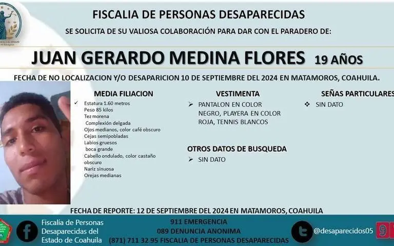 MATAMOROS, Coahuila.- La Fiscalía de Personas Desaparecidas de Coahuila ha emitido una ficha de búsqueda para Juan Gerardo Medina Flores, un joven de 19 años que fue reportado como desaparecido el pasado 10 de septiembre de 2024 en el municipio de Matamoros.