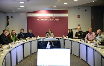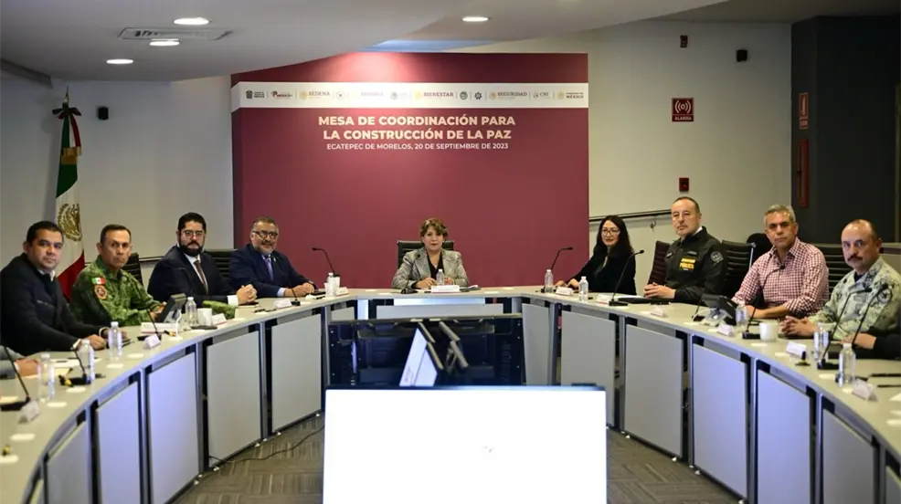 ECATEPEC, Estado de México.- La Gobernadora del Estado de México, Delfina Gómez Álvarez, encabezó la Mesa de Coordinación para la Construcción de la Paz en el Centro de Control, Comando, Comunicación, Cómputo y Calidad (C5) del municipio de Ecatepec, a fin de revisar, atender y dar seguimiento a todos los temas relacionados con la seguridad en el Estado de México.