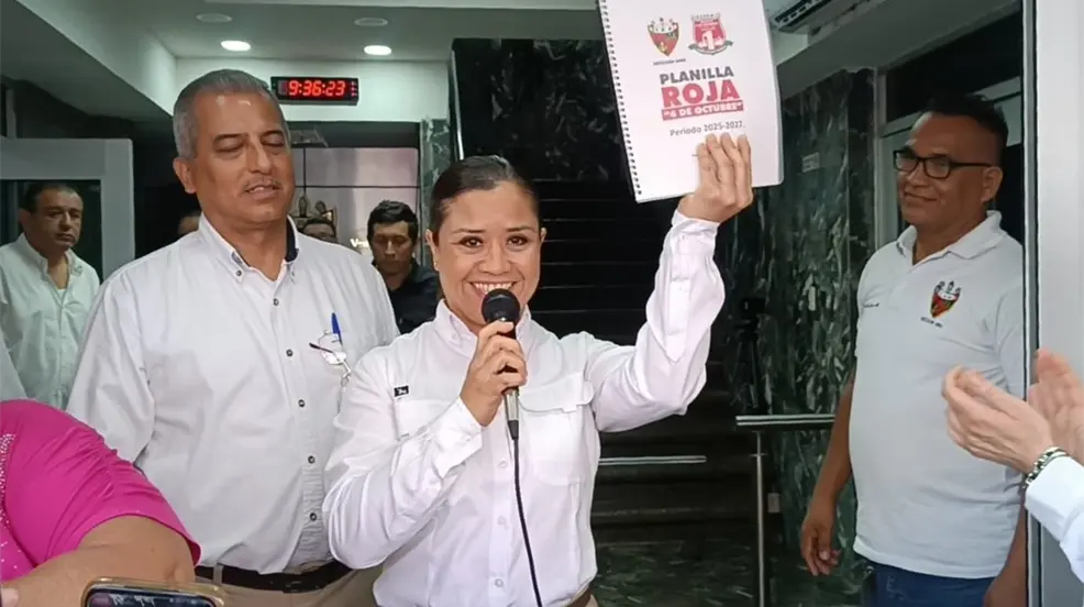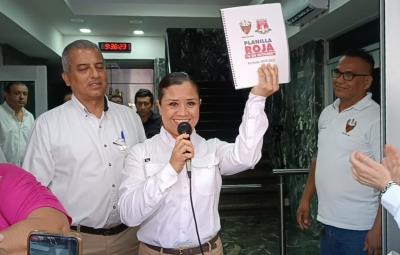 CIUDAD MADERO, Tamaulipas.- La licenciada Fabiola Rodríguez Saucedo acudió a registrarse por la Planilla Roja “grupo 4 de Octubre”, con la intención de ser la próxima secretaria de la Sección Uno del sindicato petrolero.
