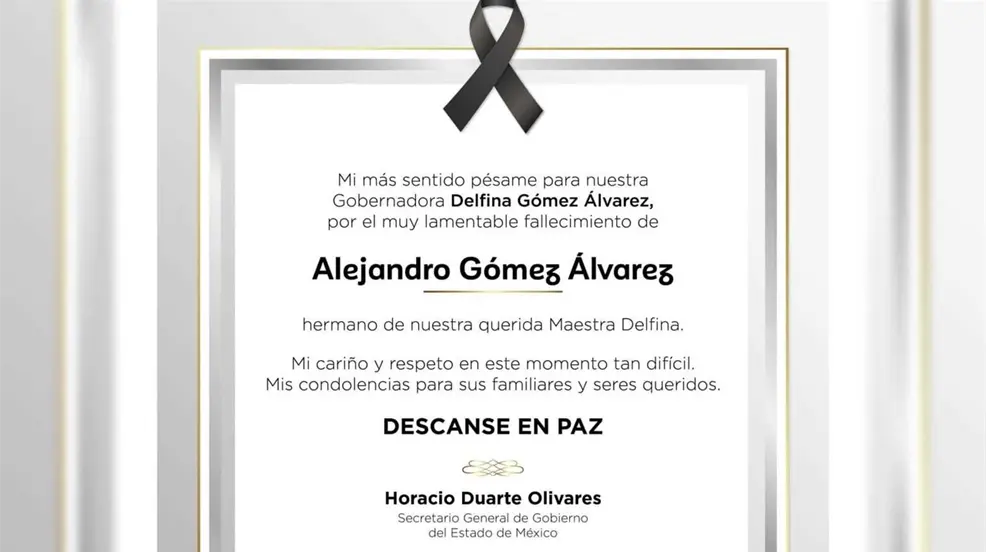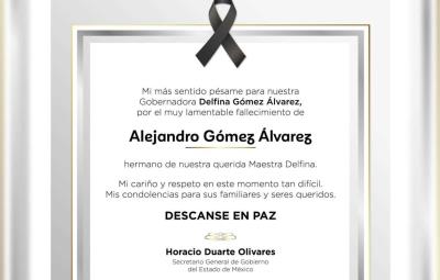 TOLUCA, Estado de México.- Se informó esta mañana el fallecimiento de Alejandro Gómez Álvarez, hermano de la gobernadora del Estado de México. Los integrantes del gabinete legal y ampliado, así como líderes políticos y sociales, han expresado sus condolencias hacia la titular del Poder Ejecutivo, Delfina Gómez Álvarez.