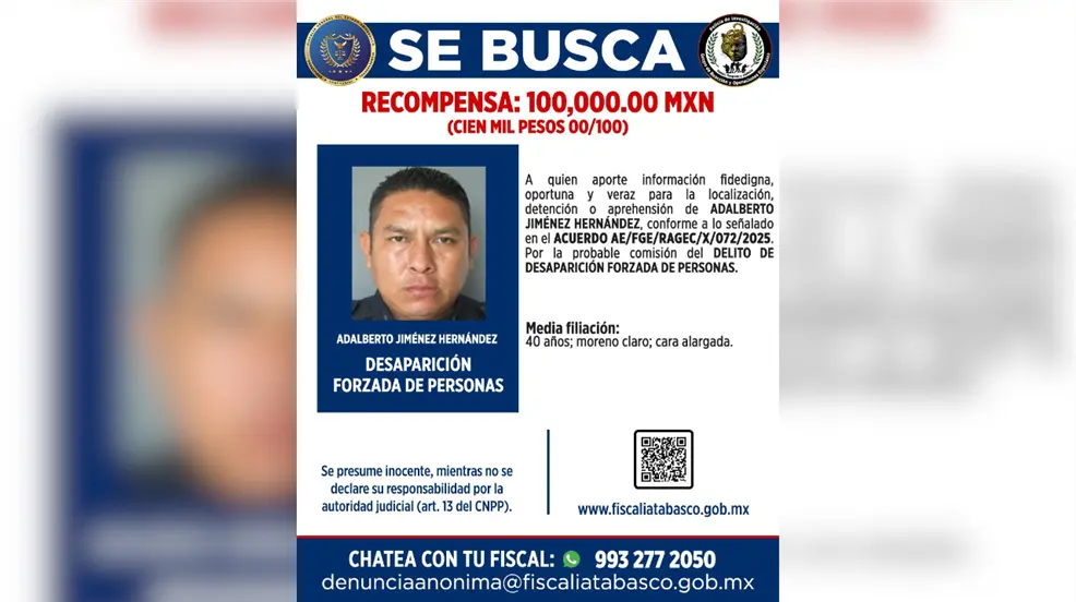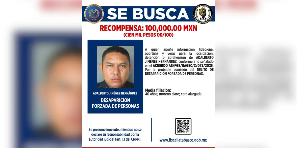 La Fiscalía General del Estado de Tabasco anunció la tarde de este miércoles el ofrecimiento de una recompensa económica a la ciudadanía para obtener información que conduzca a la localización y captura de nueve individuos vinculados a una investigación por el delito de desaparición forzada.