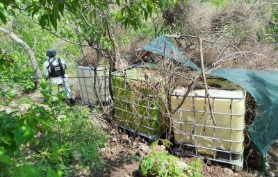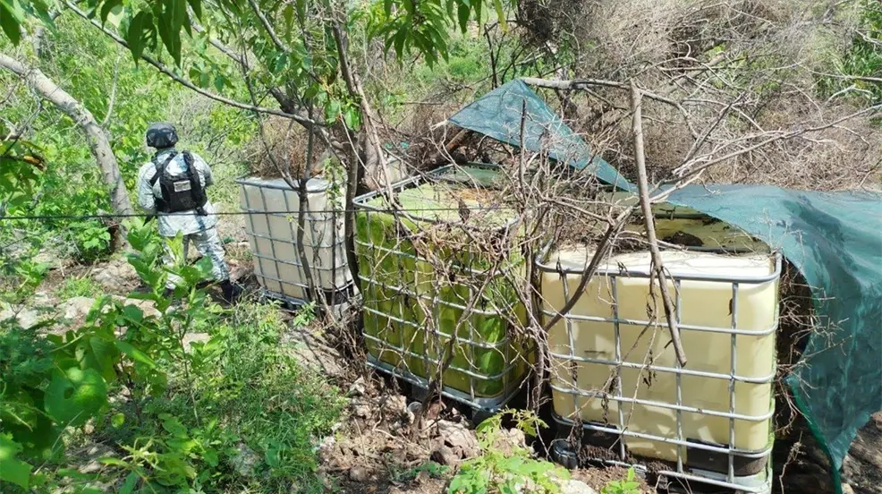 A pesar de que el operativo de seguridad no logró identificar a los responsables en el lugar, se encontraron dos cisternas de plástico de 5 mil litros cada una y tres contenedores de 1,200 litros ocultos entre lonas y hojarasca. Estos estaban cargados con combustible de procedencia ilícita.