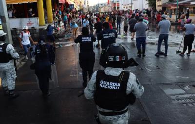 Personal de la Guardia Nacional mexicana y policías municipales impidieron que migrantes haitianos instalaran un mercado ambulante en Tapachula, Chiapas