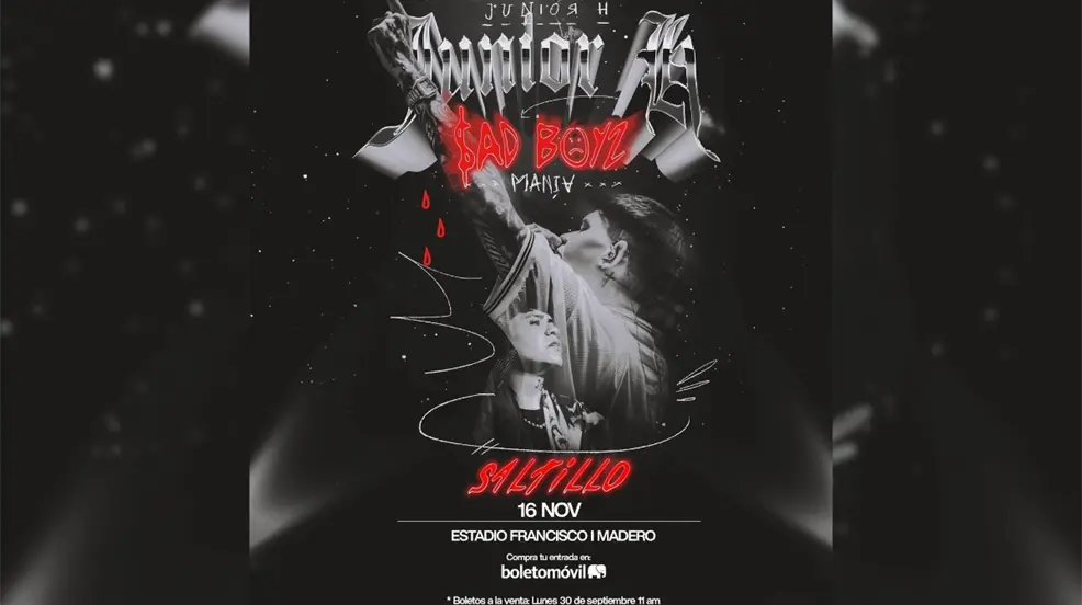 SALTILLO, Coahuila. El popular intérprete de corridos tumbados, Junior H, ha confirmado su tan esperada presentación en la capital de Coahuila como parte de su gira Sad Boyz Manía 2024. El joven cantante y compositor, cuyo verdadero nombre es Antonio Herrera Pérez, se presentará el próximo sábado 16 de noviembre en el Estadio Francisco I. Madero.
