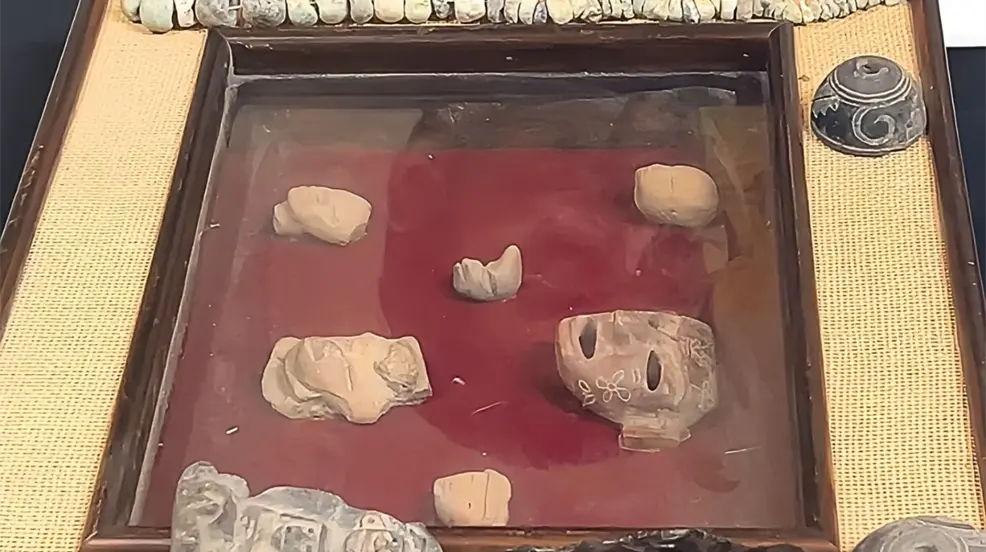 Además también se encuentra un collar de cuentas esféricas elaboradas en roca de coloración verdosa; un cuchillo bifacial y un par de malacates.