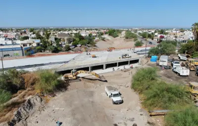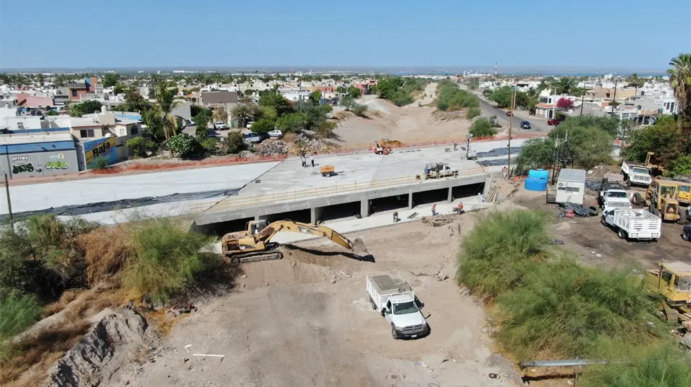 LA PAZ, Baja California Sur.- La construcción del puente sobre el bulevar Luis Donaldo Colosio, entre la calle Durango y el bordo de contención, registra un avance del 95%, según informó el director general de la Junta Estatal de Caminos (JEC), Jorge Alberto Cota Pérez. Este proyecto es parte de las acciones autorizadas por el Gobierno del Estado a través del Fideicomiso para la Atención de Daños Ocasionados por Desastres Naturales (FANDEM).