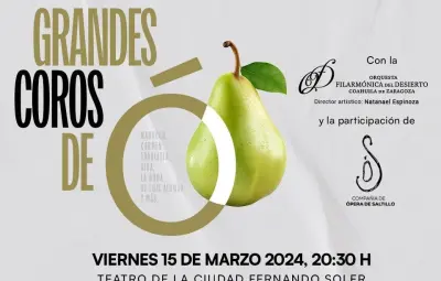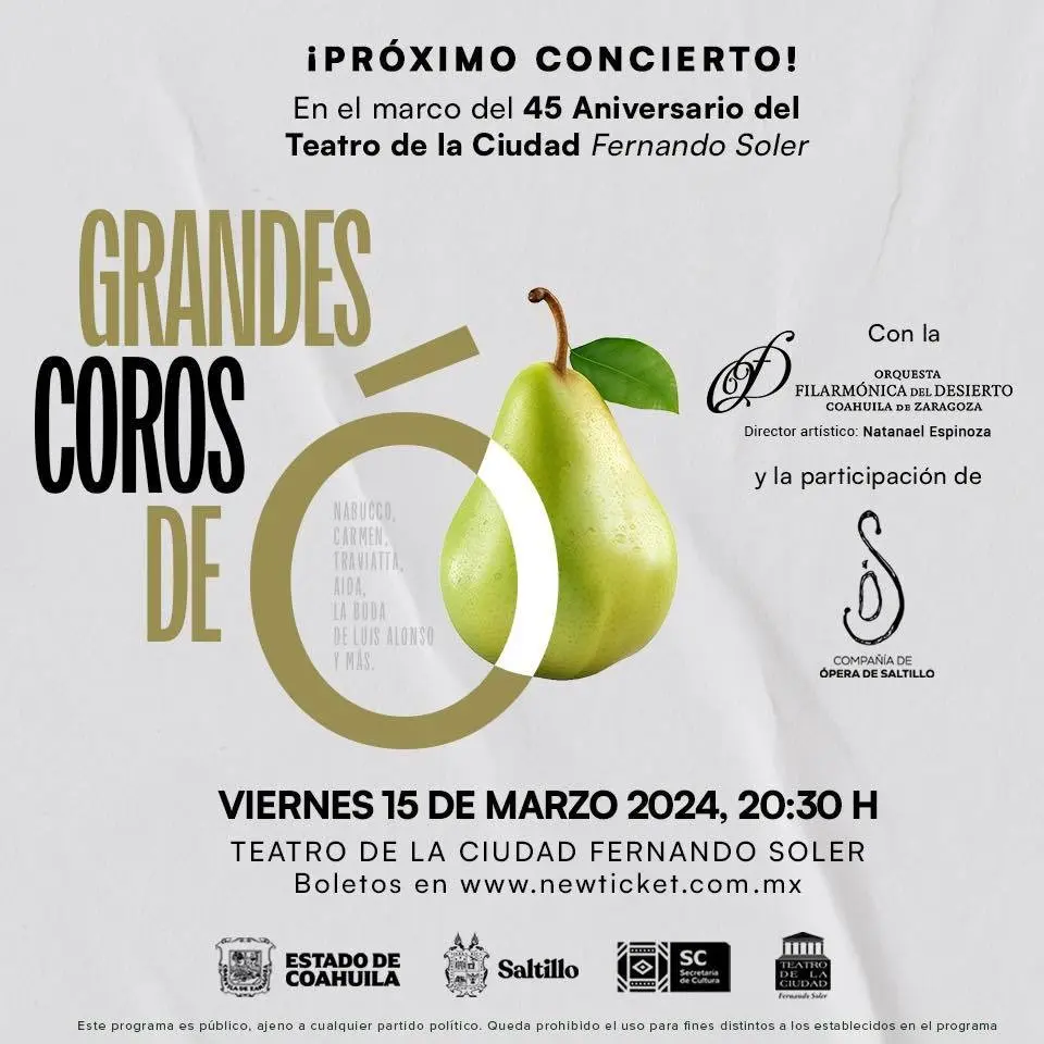 Además estará Grandes Coros de Ópera este viernes 15 de marzo a cargo de la Orquesta Filarmónica del Desierto y la Compañía de Ópera de Saltillo en el Teatro de la Ciudad Fernando Soler a las 20:00 horas, boletos en New Ticket.