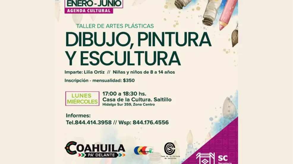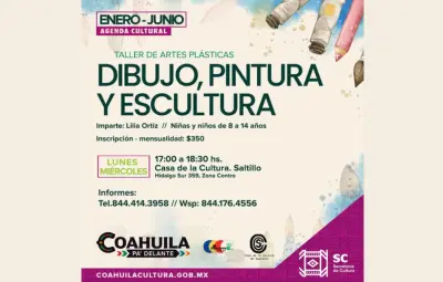 SALTILLO, Coahuila. La secretaría de cultura invita a niños de 8 a 14 años al Taller de Artes Plásticas "Dibujo, Pintura y Escultura", impartido por Lilia Ortiz en la Casa de la Cultura de Saltillo.