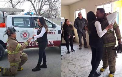 FRONTERA, Coahuila.- En este 14 de febrero, Día del Amor y la Amistad, un elemento del Heroico Cuerpo de Bomberos sorprendió a su novia con una propuesta de matrimonio muy original.