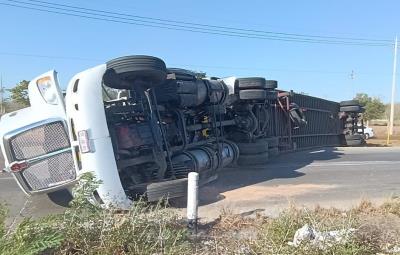 Tráiler termina volcado en la Mérida-Cancún por un tubo en la carretera