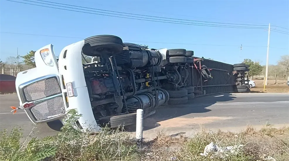 MÉRIDA, Yucatán.- En la mañana de hoy, alrededor de las 8 a.m., se registró un accidente vehicular en el kilómetro 15 de la carretera Mérida-Cancún, justo después de pasar la estación del Tren Maya en Teya. Un camión de carga, que había partido de Mérida con destino a Quintana Roo, volcó en un incidente que afectó el flujo vehicular hacia Cancún.