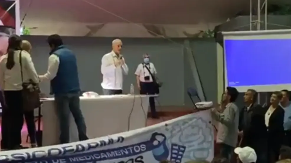 VIDEO: Protestan por desabasto de medicamentos en conferencia de López-Gatell