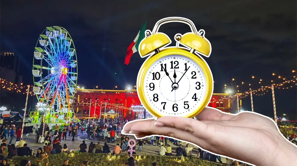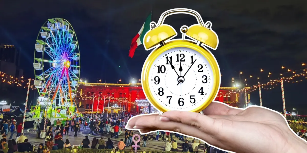 Un reloj y de fondo las atracciones de la MacroNavidad 2025 en Nuevo León. Foto: Composición Canva I POSTA