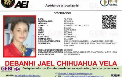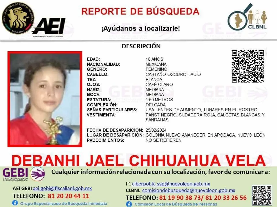 Si tienes información que pueda ayudar en la búsqueda de Debanhi Jael Chihuahua, por favor comunícate con el Grupo Especializado de Búsqueda Inmediata al 81 20 20 44 11 o con la Comisión de Búsqueda Nuevo León al 81 19 91 38 73 / 81 20 33 26 56. Tu colaboración puede ser clave para encontrar a Debanhi y llevarla de regreso a su hogar.