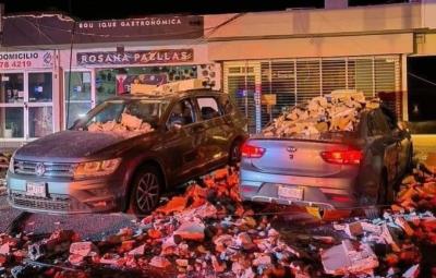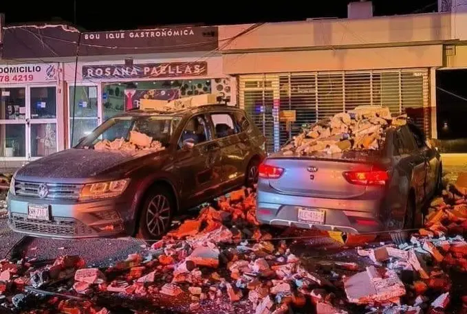Cae marquesina por ventarrones y deja autos destrozados