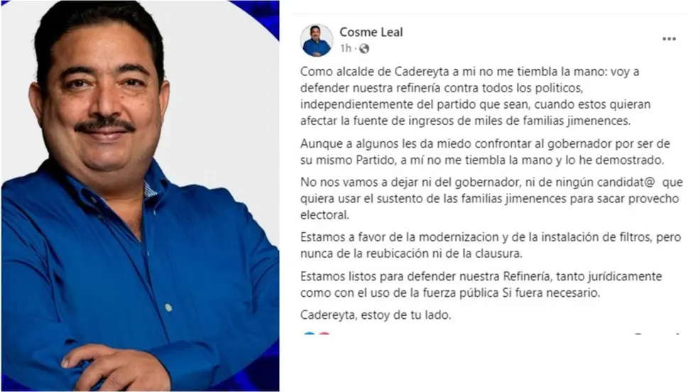 CADEREYTA JIMÉNEZ, Nuevo León.- El alcalde de Cadereyta, Cosme Leal, ha dejado claro que no dudará en tomar medidas para proteger la Refinería de Pemex de cualquier intento de cierre o reubicación por parte de políticos, incluyendo al gobernador Samuel García y candidatos de cualquier partido.