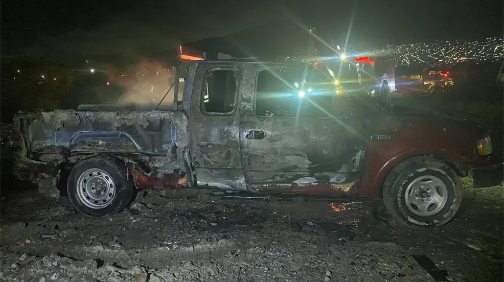 La camioenta quedó en mayor parte consumida por el incendio, del cual se rescató a una niña. Foto: Facebook Al Día N.L.