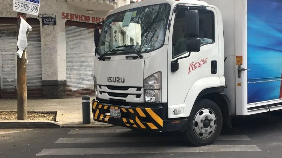 Camión de compañía refresquera invadiendo un paso peatonal en Monterrey. Foto: X @CulturaVial.