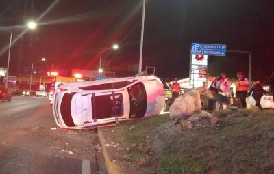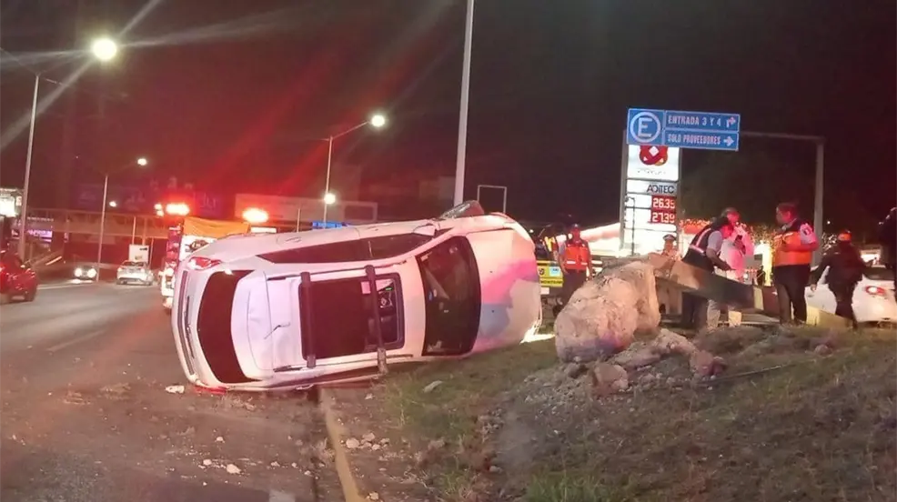 MONTERREY, Nuevo León.- Elementos de Protección Civil Nuevo León acudieron a un reporte de un vehículo particular semi volcado en avenida Lázaro Cárdenas, Adolfo Laubner Galerías Valle Oriente, Monterrey.