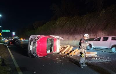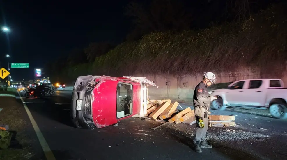 Una camioneta volcó tras chocar contra un muro en la Carretera Nacional en la colonia La Estanzuela.